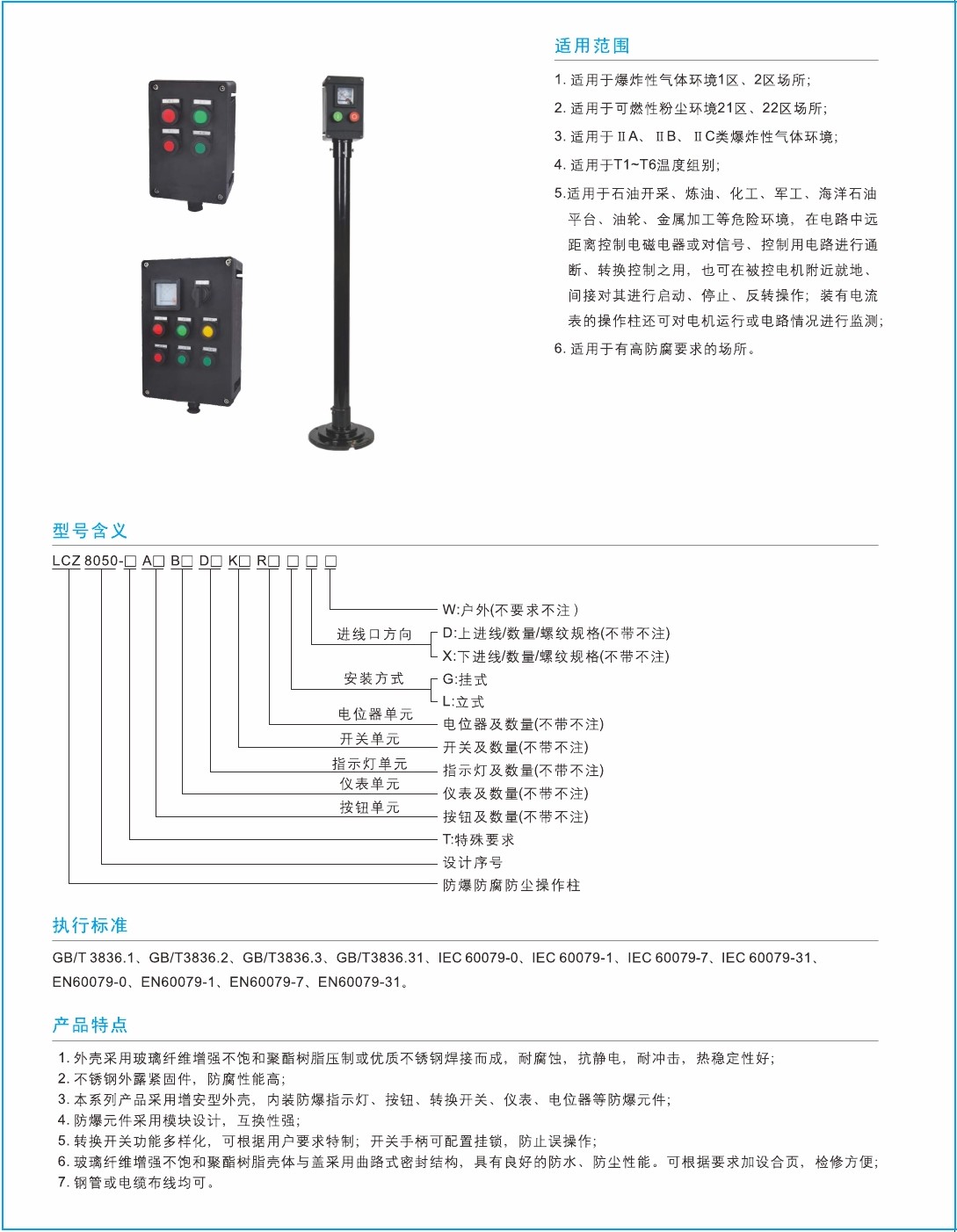 3.本系列产品采用增安型外壳,内装防指示灯、按钮、转换开关、仪表、电位器等防爆元件;