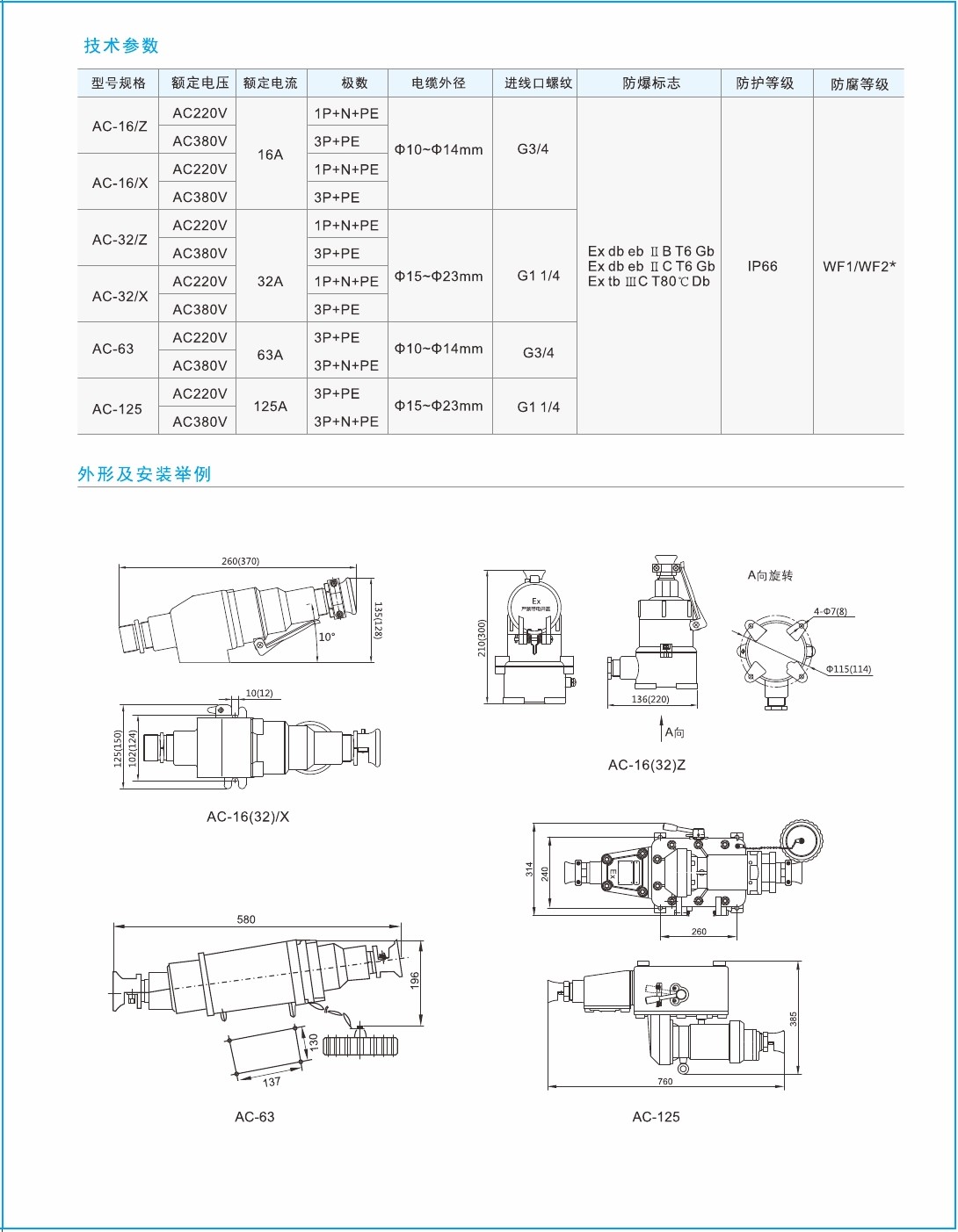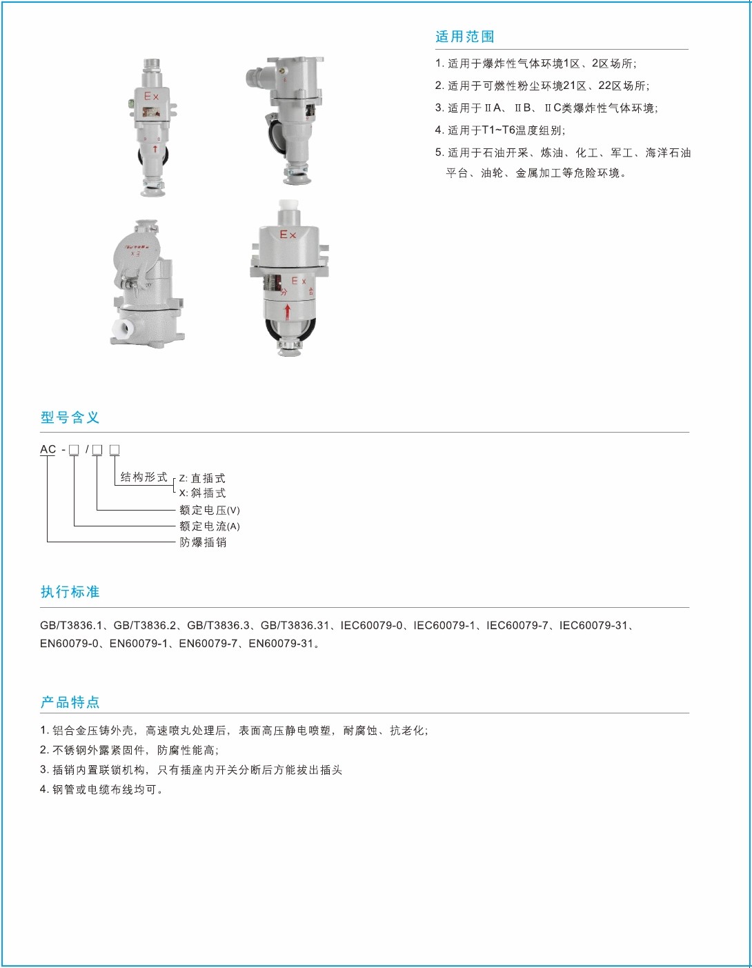 1.铝合金压铸外壳,高速喷丸处理后,表面高压静电喷塑,耐腐蚀、抗老化2.不锈钢外露紧固件,防腐性能高; 3.插销内置联锁机构,只有插座内开关分断后方能拔出插头4.钢管或电缆布线均可