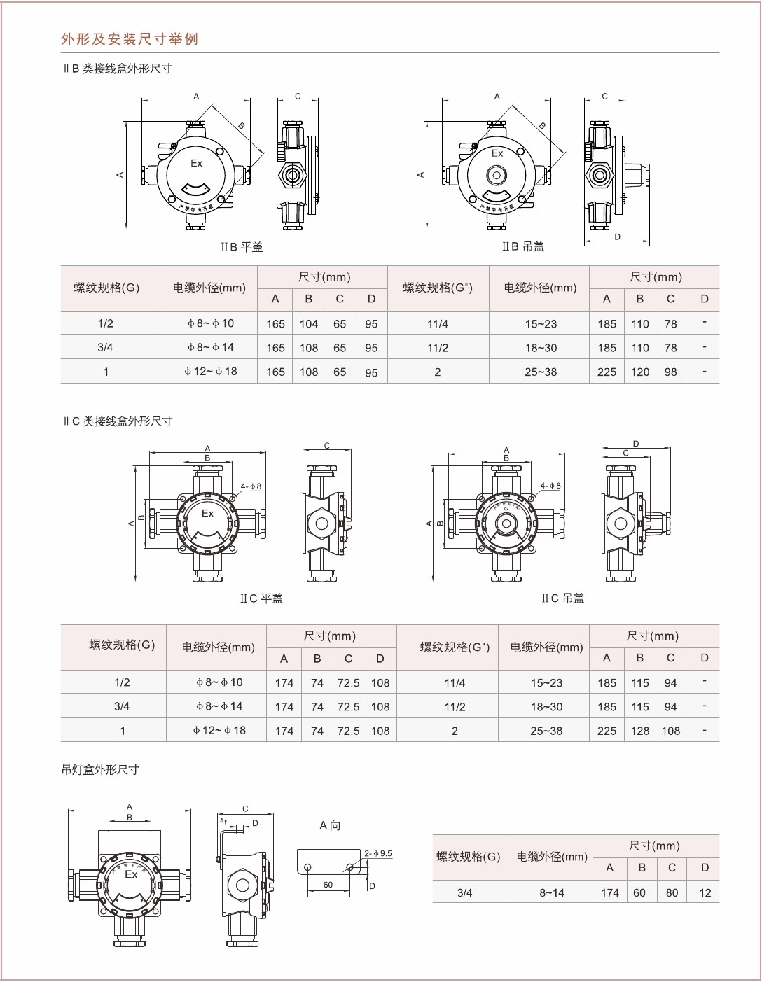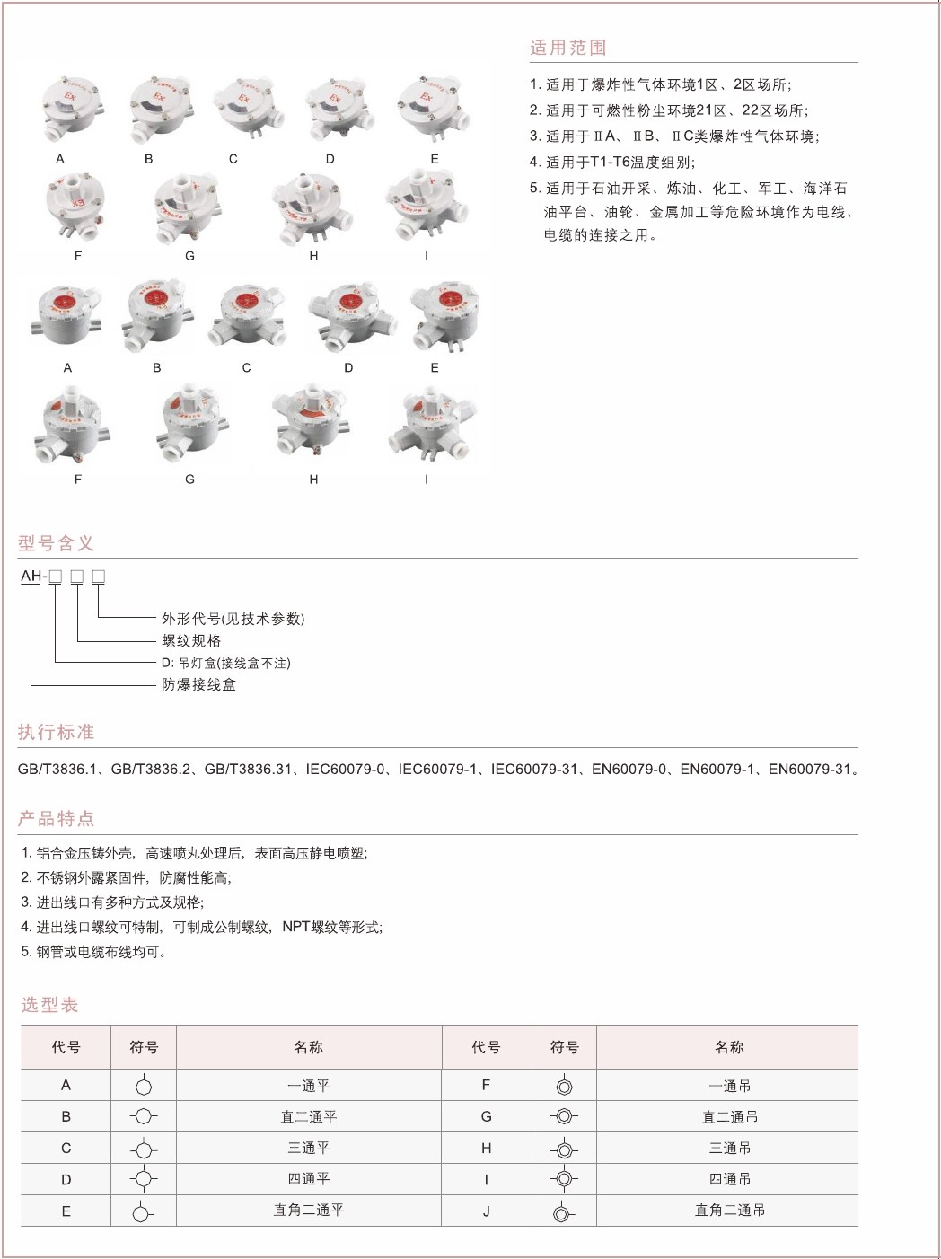 1.铝合金压铸外壳,高速喷丸处理后,表面高压静电喷塑;2.不锈钢外露紧固件,防腐性能高; 3.进出线口有多种方式及规格; 4.进出线口螺纹可特制,可制成公制螺纹,NPT螺纹等形式; 5.钢管或电缆布线均可。