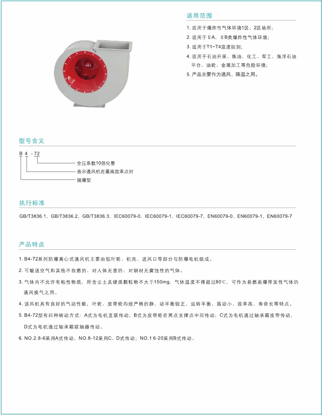 5.B4-72型有四种转动方式:A式为电机直联传动:B式为皮带轮在两点支撑点中间传动:C式为电机通过轴承箱皮带传动D式为电机通过轴承箱联轴器传动。