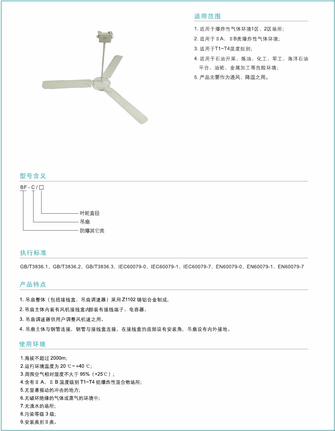 1.吊扇整体(包括接线盒、吊扇调速器)采用Z1102铸铝合金制成,