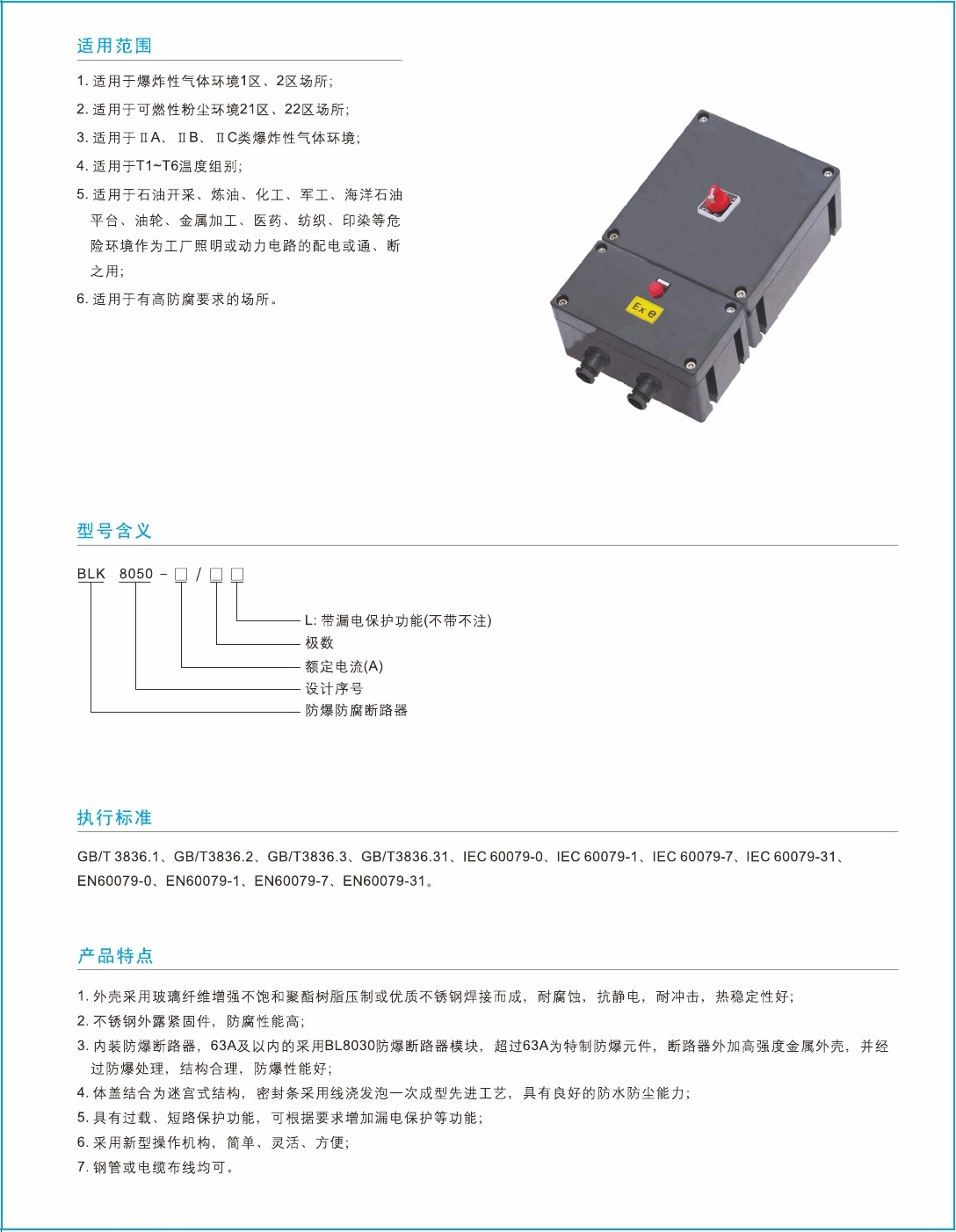 3.内装防爆断路器,63A及以内的采用BL8030防爆断路器模块,超过63A为特制防爆元件,断路器外加高强度金属外壳,并经过防爆处理,结构合理,防爆性能好;