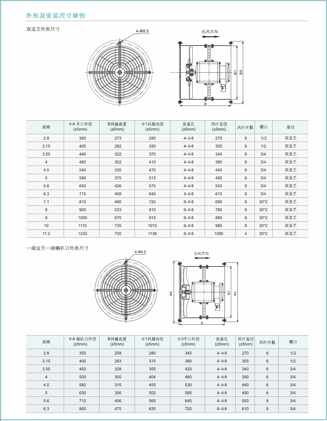 1.防爆轴流风机由防爆电机、扇叶、风简等部分组成;