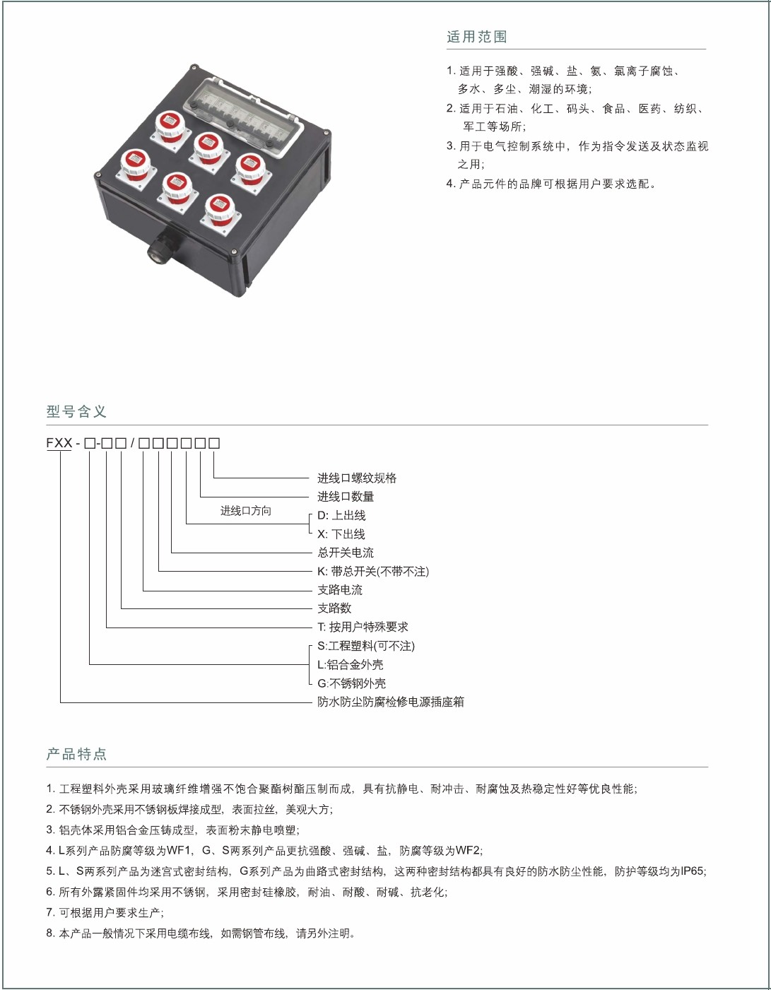 1.工程塑料外壳采用玻璃纤维增强不饱合聚酯树酯压制而成,具有抗静电、耐冲击、耐腐蚀及热稳定性好等优良性能;