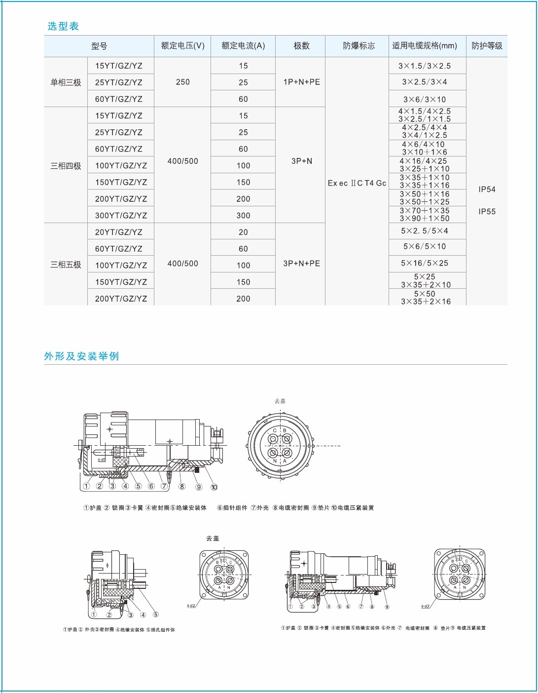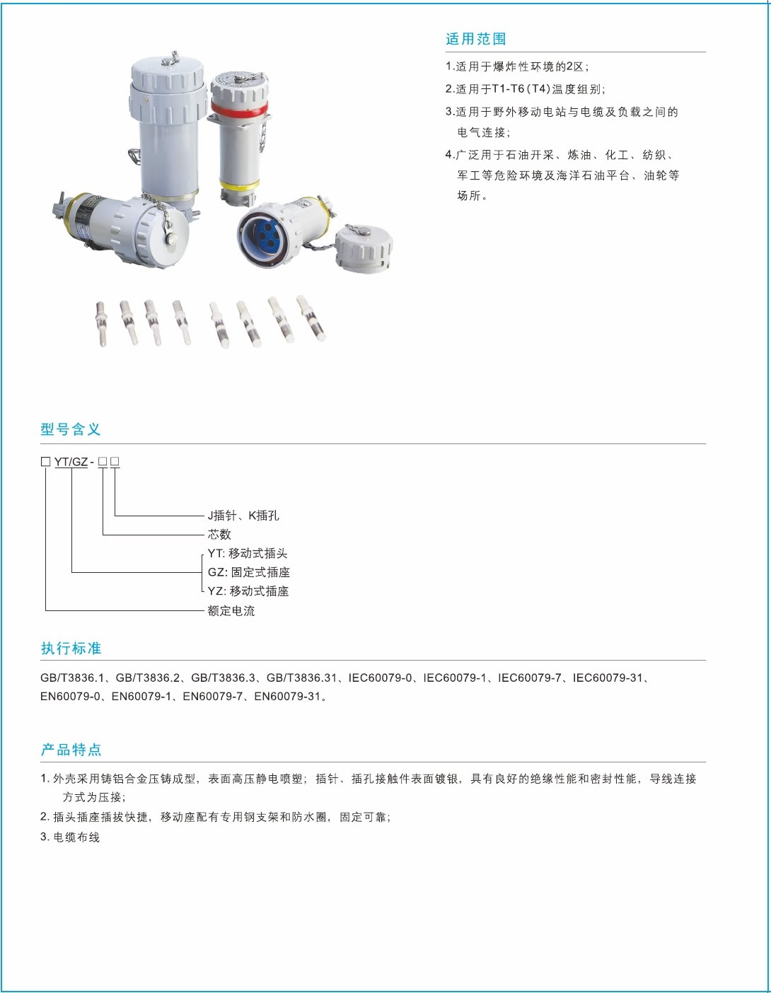 1.外壳采用铸铝合金压铸成型,表面高压静电喷塑;插针、插孔接触件表面镀银,具有良好的绝缘性能和密封性能,导线连接 方式为压接; 2.插头插座插拔快捷,移动座配有专用钢支架和防水圈,固定可靠;3.电缆布线;
